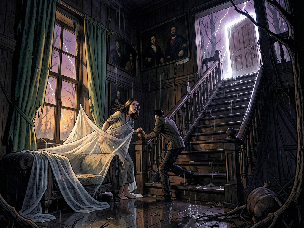 We were hiking in dense woods when a sudden rainstorm blew up. We ran, looking for shelter, and came upon an old, abandoned house—a mansion, really, that must have once been beautiful.
